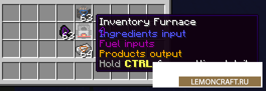 Мод FactInventory добавляет в игру два новых предмета, которые будут работать прямо в инвентаре. Первое устройство автоматизирует перемещение предметов в вашем инвентаре. Данное устройство имеет два уровня работы - быстрый и медленный. При быстрой работе предметы перемещаются каждую 1 секунду, при медленной - каждые 8 секунд. Вторым устройством является печь, которая позволяет плавить предметы прямо в инвентаре.